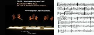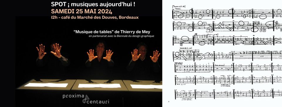 En clin d’œil à la Biennale du design graphique qui se tient du 23 au 26 mai 2024 à Bordeaux, les musiciens de Proxima Centauri interprèteront « 𝗠𝘂𝘀𝗶𝗾𝘂𝗲 𝗱𝗲 𝘁𝗮𝗯𝗹𝗲𝘀 » de Thierry de Mey.